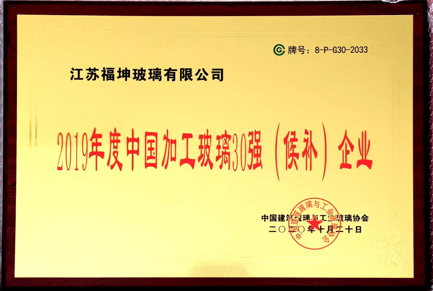 | 江蘇福坤玻璃有限公司榮膺中國(guó)加工玻璃準(zhǔn)30強(qiáng)榮譽(yù)稱號(hào) | |